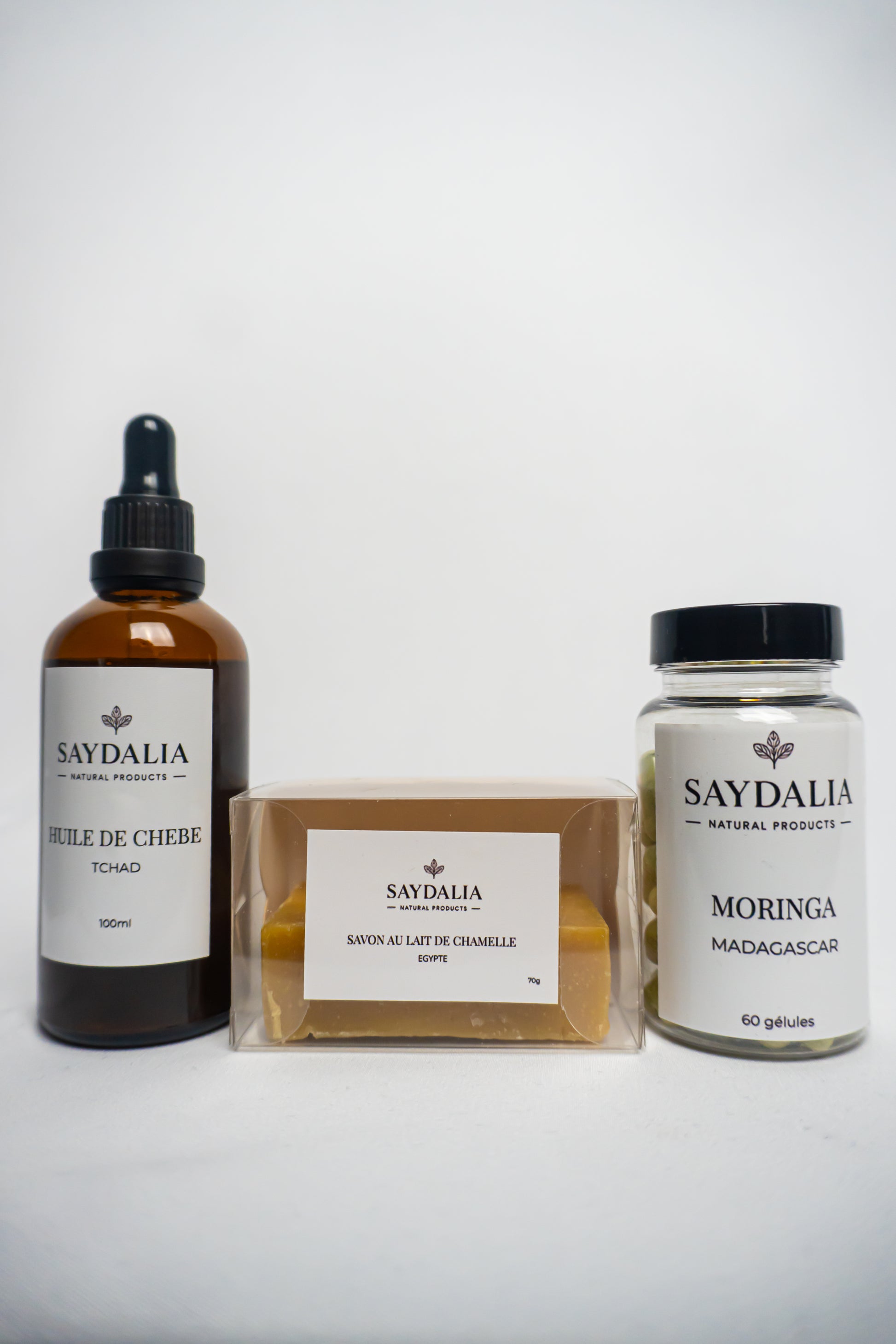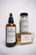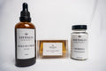 Ce pack combine des soins externes (savon et huile) avec un complément alimentaire riche en nutriments pour une routine beauté globale.